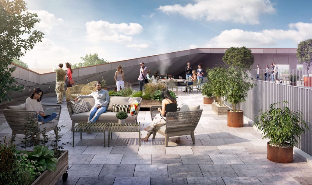 På øverste etage er der en stor fælles tagterrasse. Herfra er der en helt fantastisk udsigt over København, og det vil være et meget naturligt samlingspunkt for alle beboerne, uanset om man nu trænger til at nyde solen, studere i det fri, spise sin mad, eller blot mødes på kryds og tværs med de andre beboere.